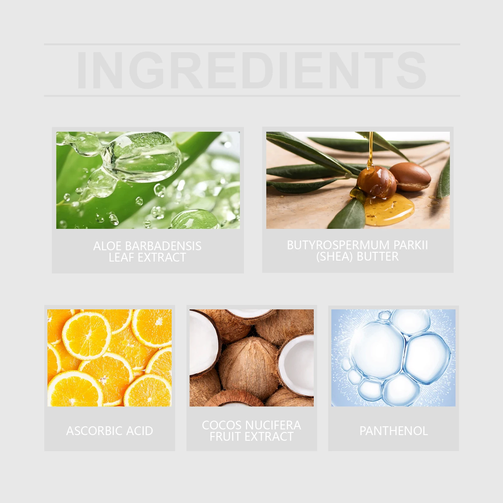 ALOE BARBADENSIS LEAF EXTRACT、BUTYROSPERMUM PARKII (SHEA) BUTTER、ASCORBIC ACID、PANTHENOL、COCOS NUCIFERA (COCONUT) FRUIT EXTRACT