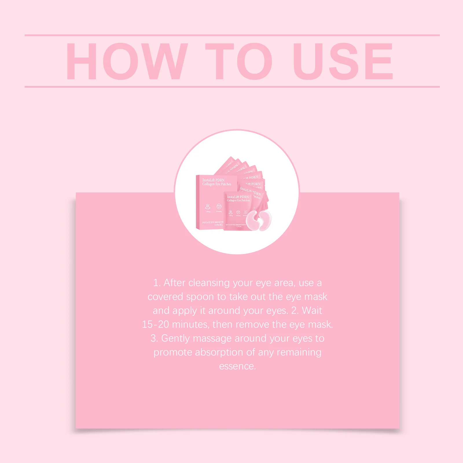 After cleansing the skin around your eyes, apply the eye patches under your eyes. As your skin absorbs the active ingredients, the collagen eye patches will gradually become transparent. Remove under eye mask after it’s fully absorbed. Use 3-4 times a week for better results.