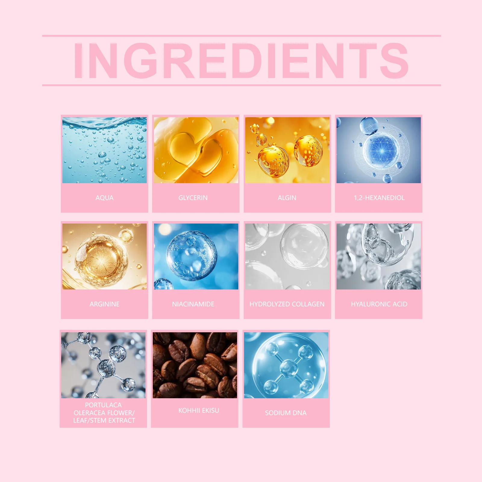 ● Main Ingredients: Hydrolyzed Collagen, Niacinamide, Hyaluronic Acid, Caffeine, Purslane Extract