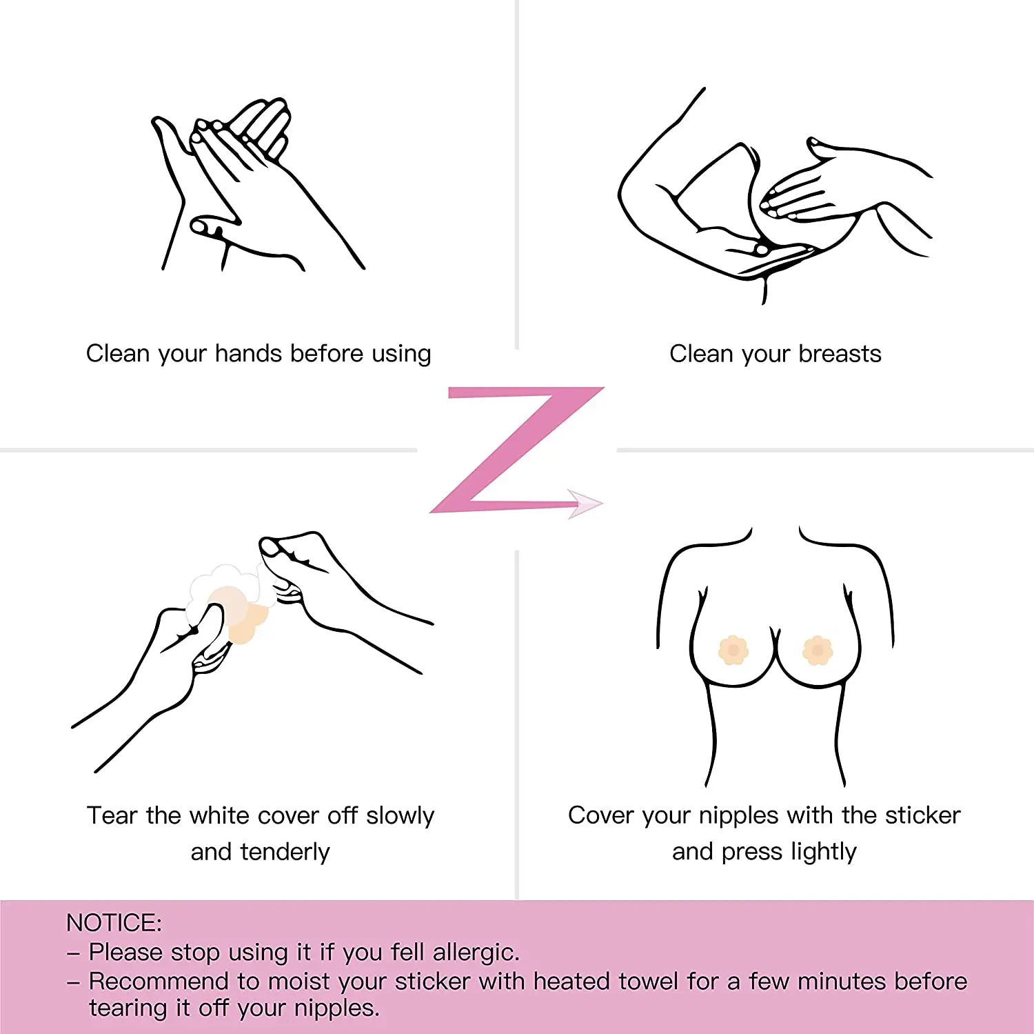 First tear the back glue of the lower half of the semicircular notch, paste it above the areola and smooth it on both sides