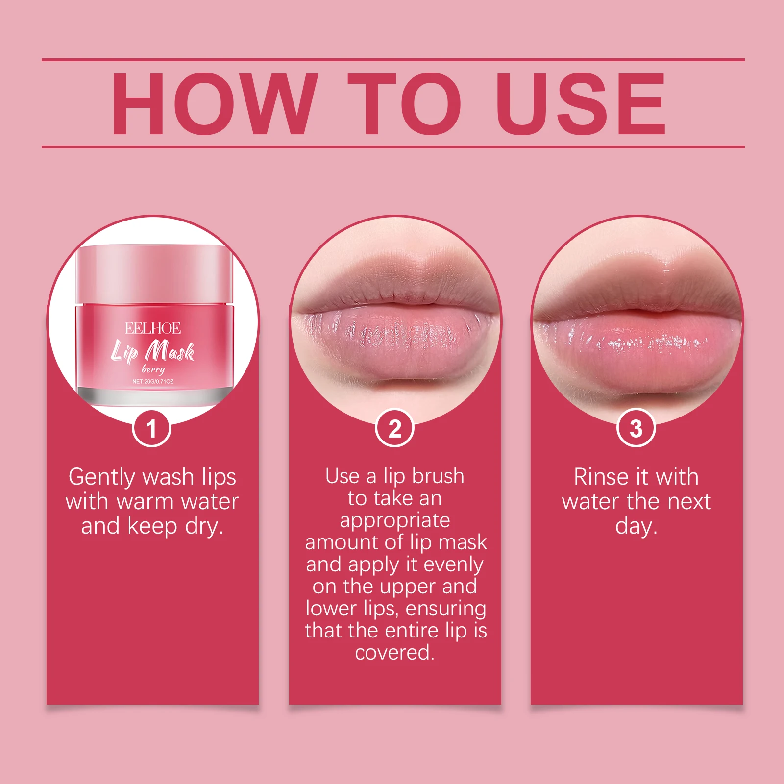 Clean your lips before going to bed;Apply an appropriate amount of lip mask evenly on your lips;Wash off the next morning, and massage your lips to enhance absorption.
