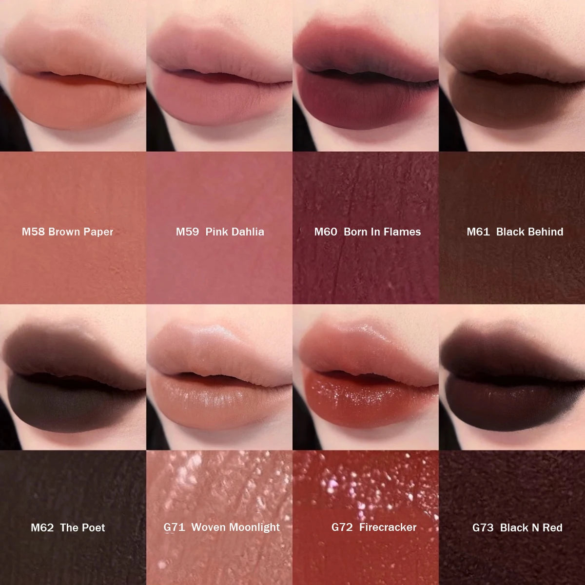 Unlock the poetic fusion of history and beauty with the Girlcult Four Great Inventions Love Whisper Matte Lip Stain Complete Collection, a meticulously curated set of eight velvety matte shades that celebrate the spirit of ancient Chinese innovation. Now available in one seamless link, this full range brings you the depth of M58 Brown Paper, a soft, earthy nude inspired by traditional parchment; the romantic allure of M59 Pink Dahlia, a gentle, captivating pink that blooms with understated grace; and the dramatic intensity of M60 Born In Flames, a smoky, war-tone rose that tells a story of passion and resilience. Discover the mysterious edge of M61 Black Behind, a deep, enigmatic shade that adds a touch of shadowy sophistication; the refined artistry of M62 The Poet, a rich, ink-like hue that channels literary elegance; and the sparkling energy of G72 Firecracker, a vibrant, celebratory red that captures the joy of festivity. Complete the collection with the subtle, linen-like warmth of G71 Woven Moonlight and the timeless contrast of G73 Black N Red, a classic duo that balances dark allure with bold, statement-making color. Each lip stain is crafted with a lightweight, non-drying formula that glides on smoothly, delivering intense pigment, a soft-matte finish, and all-day comfort without fading or transferring. Whether you’re wearing them alone for a signature look, layering them for custom blends, or switching shades to match your mood, this 8-piece set gives you the creative freedom to express, inspire, and redefine your lip wardrobe. Housed in artfully designed packaging that pays homage to the Four Great Inventions, this collection is more than makeup—it’s a wearable tribute to heritage, craftsmanship, and modern self-expression.