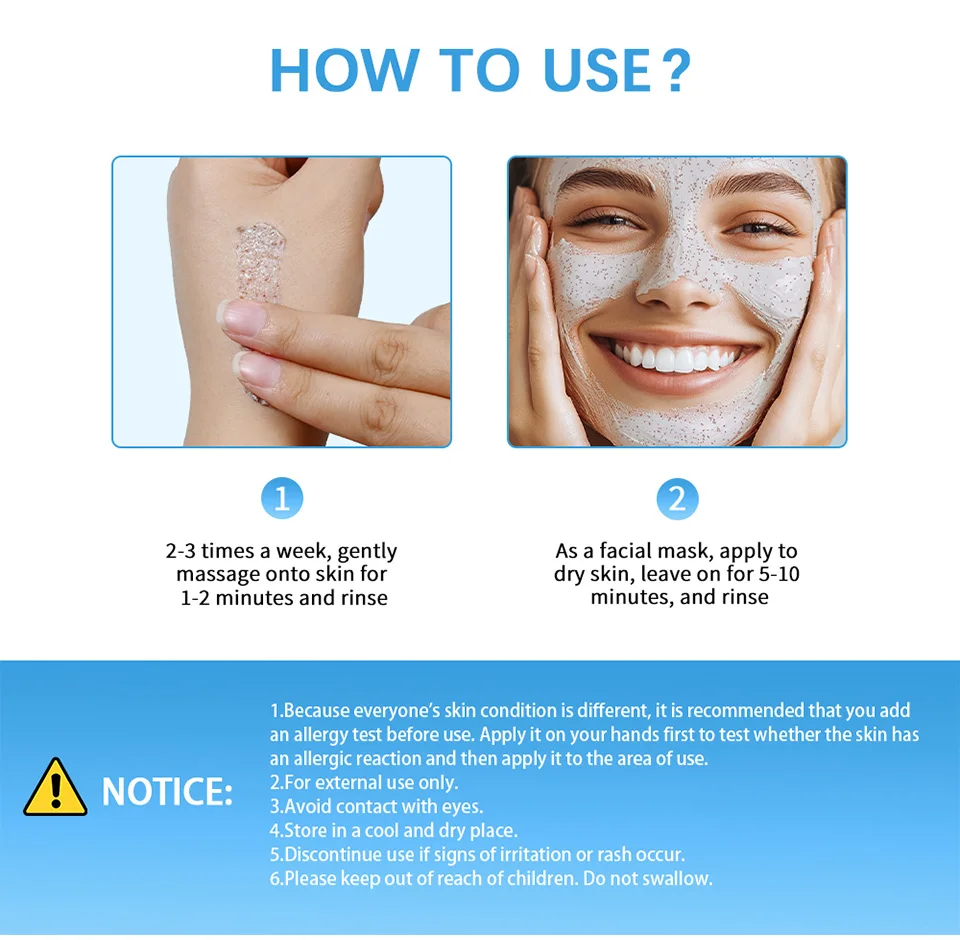 1. Use 2-3 times a week, gently massage the skin for 1-2 minutes, then rinse clean.
