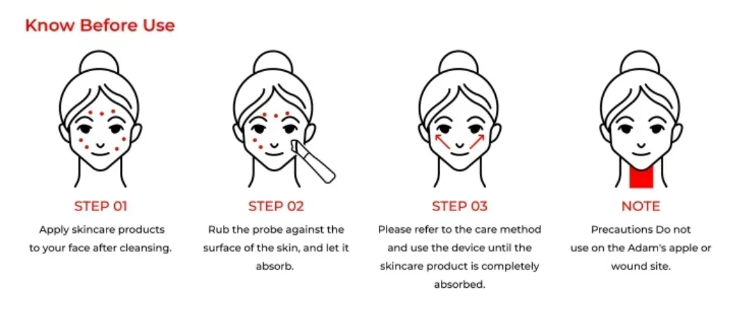 4.When using around the eyes, nose, and mouth, it is recommended to start with a low intensity, and avoid the Adam's apple.