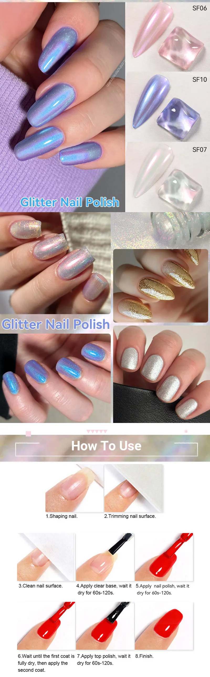 3. Apply glitter nail polish, wait it dry for 60s-120s.